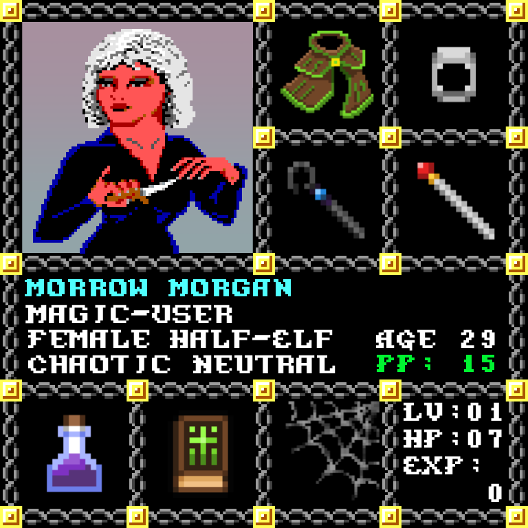 Morrow Morgan is a Female Half-Elf, born to be a Magic-User. Since her birth, for the last 29 years, her alignment has been Chaotic Neutral and she has been honing her skills with the Quarterstaff +1. She also carries the following: [Potion of Fire Resistance ] [Phlan Journal Entries 1-15] > > > Morrow Morgan is part of the Genesis Series of the Players Guild NFT Pool of Radiance Tribute.