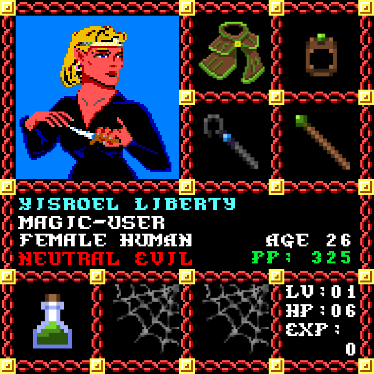 Yisroel Liberty is a Female Human, born to be a Magic-User. Since her birth, for the last 26 years, her alignment has been Neutral Evil and she has been honing her skills with the Quarterstaff +1. She also carries the following: [Potion of Healing ] > > > Yisroel Liberty is part of the Genesis Series of the Players Guild NFT Pool of Radiance Tribute.