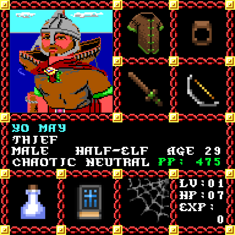 Yo May is a Male Half-Elf, born to be a Thief. Since his birth, for the last 29 years, his alignment has been Chaotic Neutral and he has been honing his skills with the Short Sword. He also carries the following: [Potion of Speed] [Phlan Journal Entries 16-28] > > > Yo May is part of the Genesis Series of the Players Guild NFT Pool of Radiance Tribute.