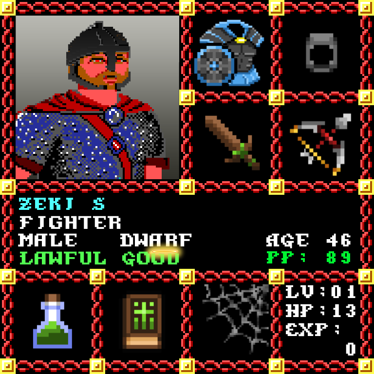 Zeki S is a Male Dwarf, born to be a Fighter. Since his birth, for the last 46 years, his alignment has been Lawful Good and he has been honing his skills with the Broadsword. He also carries the following: [Potion of Healing ] [Phlan Journal Entries 1-15] > > > Zeki S is part of the Genesis Series of the Players Guild NFT Pool of Radiance Tribute.