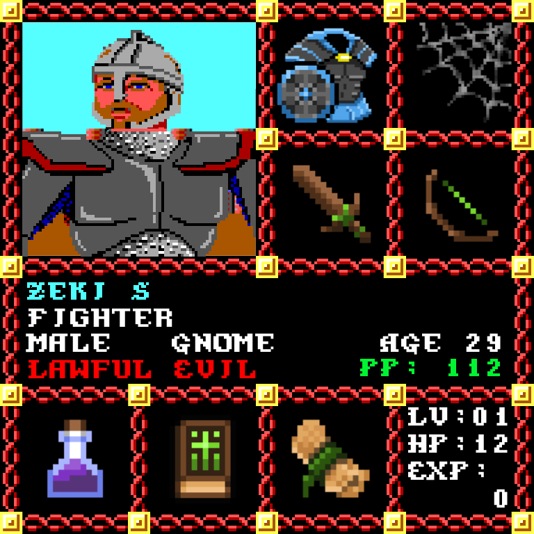 Zeki S is a Male Gnome, born to be a Fighter. Since his birth, for the last 29 years, his alignment has been Lawful Evil and he has been honing his skills with the Broadsword. He also carries the following: [Potion of Fire Resistance ] [Phlan Journal Entries 1-15] [Scroll of Sleep x50] > > > Zeki S is part of the Genesis Series of the Players Guild NFT Pool of Radiance Tribute.