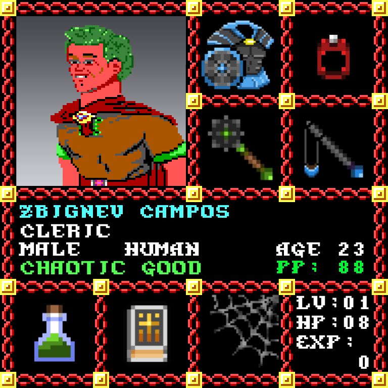 Zbignev Campos is a Male Human, born to be a Cleric. Since his birth, for the last 23 years, his alignment has been Chaotic Good and he has been honing his skills with the Mace. He also carries the following: [Potion of Healing ] [Phlan Journal Entries 29-40] > > > Zbignev Campos is part of the Genesis Series of the Players Guild NFT Pool of Radiance Tribute.