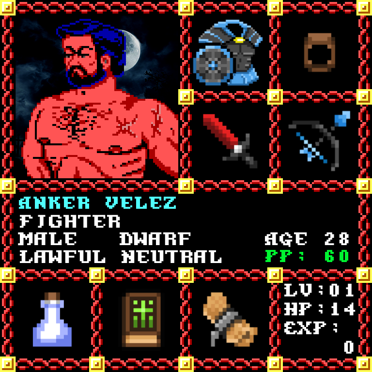 Anker Velez is a Male Dwarf, born to be a Fighter. Since his birth, for the last 28 years, his alignment has been Lawful Neutral and he has been honing his skills with the Broadsword Cursed. He also carries the following: [Potion of Speed] [Phlan Journal Entries 1-15] [Scroll of Hold Person x70] > > > Anker Velez is part of the Genesis Series of the Players Guild NFT Pool of Radiance Tribute.