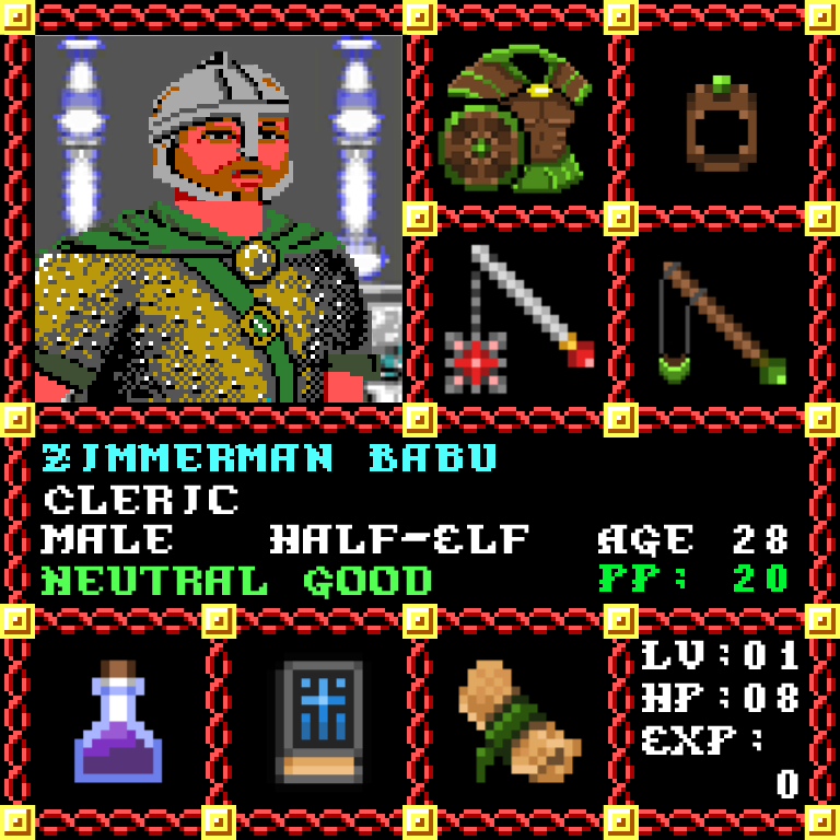 Zimmerman Babu is a Male Half-Elf, born to be a Cleric. Since his birth, for the last 28 years, his alignment has been Neutral Good and he has been honing his skills with the Flail +2. He also carries the following: [Potion of Fire Resistance ] [Phlan Journal Entries 16-28] [Scroll of Cure Light Wounds x100] > > > Zimmerman Babu is part of the Genesis Series of the Players Guild NFT Pool of Radiance Tribute.