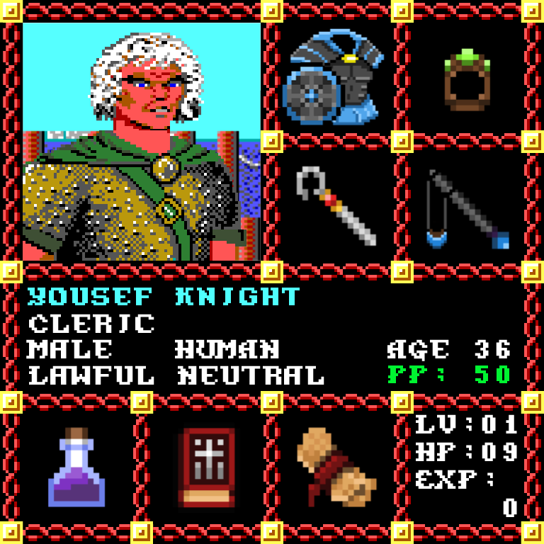 Yousef Knight is a Male Human, born to be a Cleric. Since his birth, for the last 36 years, his alignment has been Lawful Neutral and he has been honing his skills with the Staff +2. He also carries the following: [Potion of Fire Resistance ] [Phlan Journal Entries 51-58] [Scroll of Bestow Curse x50] > > > Yousef Knight is part of the Genesis Series of the Players Guild NFT Pool of Radiance Tribute.
