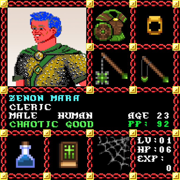 Zenon Maria is a Male Human, born to be a Cleric. Since his birth, for the last 23 years, his alignment has been Chaotic Good and he has been honing his skills with the Flail. He also carries the following: [Potion of Extra Healing ] [Phlan Journal Entries 1-15] > > > Zenon Maria is part of the Genesis Series of the Players Guild NFT Pool of Radiance Tribute.