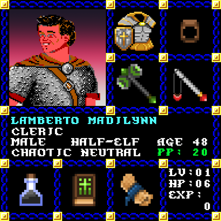 Lamberto Madilynn is a Male Half-Elf, born to be a Cleric. Since his birth, for the last 48 years, his alignment has been Chaotic Neutral and he has been honing his skills with the Hammer. He also carries the following: [Potion of Invisibility ] [Phlan Journal Entries 1-15] [Scroll of Protection from Evil x80] > > > Lamberto Madilynn is part of the Genesis Series of the Players Guild NFT Pool of Radiance Tribute.