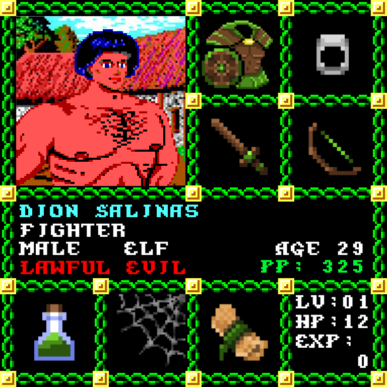 Dion Salinas is a Male Elf, born to be a Fighter. Since his birth, for the last 29 years, his alignment has been Lawful Evil and he has been honing his skills with the Short Sword. He also carries the following: [Potion of Healing ] [Scroll of Sleep x50] > > > Dion Salinas is part of the Genesis Series of the Players Guild NFT Pool of Radiance Tribute.