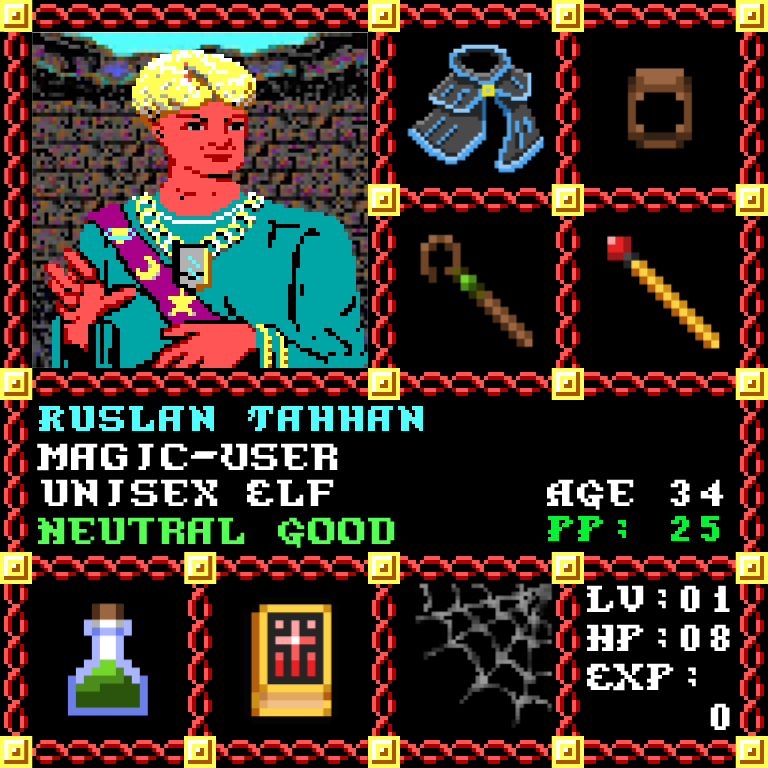 Ruslan Tahhan is a Unisex Elf, born to be a Magic-User. Since their birth, for the last 34 years, their alignment has been Neutral Good and they have been honing their skills with the Quarterstaff. They also carry the following: [Potion of Healing ] [Phlan Journal Entries 41-50] > > > Ruslan Tahhan is part of the Genesis Series of the Players Guild NFT Pool of Radiance Tribute.