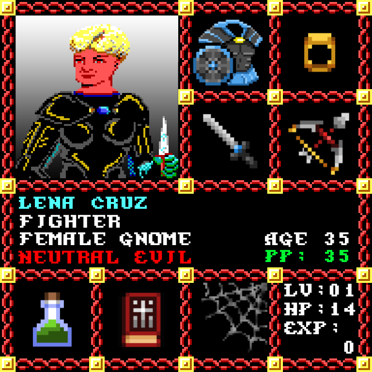 Lena Cruz is a Female Gnome, born to be a Fighter. Since her birth, for the last 35 years, her alignment has been Neutral Evil and she has been honing her skills with the Short Sword +1. She also carries the following: [Potion of Healing ] [Phlan Journal Entries 51-58] > > > Lena Cruz is part of the Genesis Series of the Players Guild NFT Pool of Radiance Tribute.