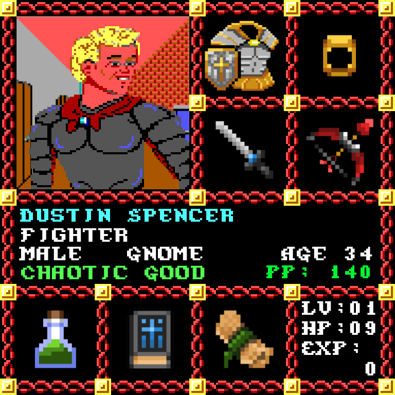 Dustin Spencer is a Male Gnome, born to be a Fighter. Since his birth, for the last 34 years, his alignment has been Chaotic Good and he has been honing his skills with the Short Sword +1. He also carries the following: [Potion of Healing ] [Phlan Journal Entries 16-28] [Scroll of Sleep x50] > > > Dustin Spencer is part of the Genesis Series of the Players Guild NFT Pool of Radiance Tribute.