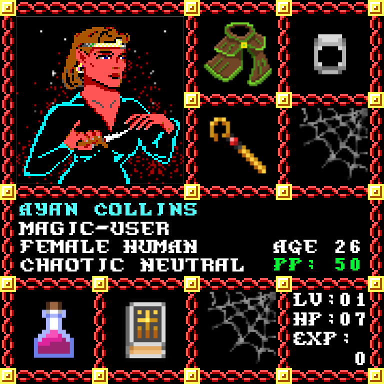 Ayan Collins is a Female Human, born to be a Magic-User. Since her birth, for the last 26 years, her alignment has been Chaotic Neutral and she has been honing her skills with the Quarterstaff +3. She also carries the following: [Potion of Strength] [Phlan Journal Entries 29-40] > > > Ayan Collins is part of the Genesis Series of the Players Guild NFT Pool of Radiance Tribute.