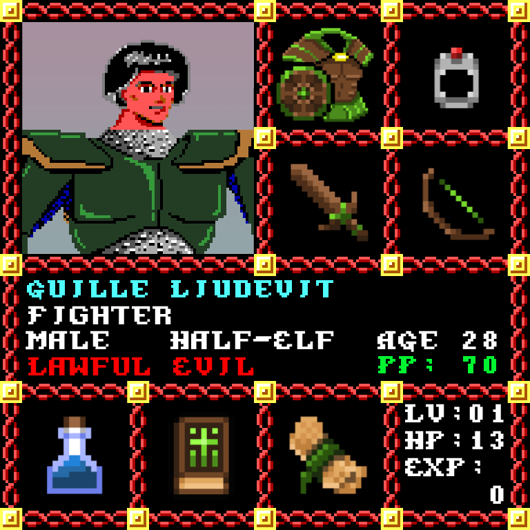 Guille Liudevit is a Male Half-Elf, born to be a Fighter. Since his birth, for the last 28 years, his alignment has been Lawful Evil and he has been honing his skills with the Broadsword. He also carries the following: [Potion of Extra Healing ] [Phlan Journal Entries 1-15] [Scroll of Cure Light Wounds x100] > > > Guille Liudevit is part of the Genesis Series of the Players Guild NFT Pool of Radiance Tribute.