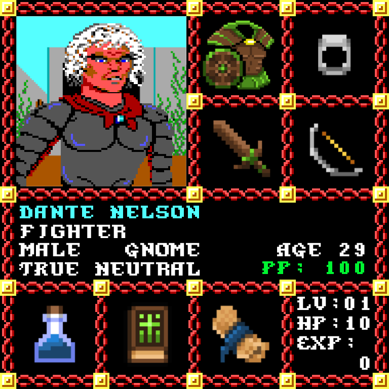 Dante Nelson is a Male Gnome, born to be a Fighter. Since his birth, for the last 29 years, his alignment has been True Neutral and he has been honing his skills with the Broadsword. He also carries the following: [Potion of Extra Healing ] [Phlan Journal Entries 1-15] [Scroll of Protection from Evil x80] > > > Dante Nelson is part of the Genesis Series of the Players Guild NFT Pool of Radiance Tribute.
