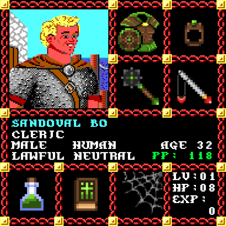 Sandoval Bo is a Male Human, born to be a Cleric. Since his birth, for the last 32 years, his alignment has been Lawful Neutral and he has been honing his skills with the Mace. He also carries the following: [Potion of Healing ] [Phlan Journal Entries 1-15] > > > Sandoval Bo is part of the Genesis Series of the Players Guild NFT Pool of Radiance Tribute.