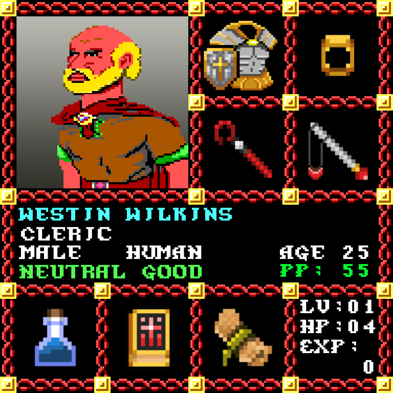 Westin Wilkins is a Male Human, born to be a Cleric. Since his birth, for the last 25 years, his alignment has been Neutral Good and he has been honing his skills with the Staff Cursed. He also carries the following: [Potion of Extra Healing ] [Phlan Journal Entries 41-50] [Scroll of Remove Curse x60] > > > Westin Wilkins is part of the Genesis Series of the Players Guild NFT Pool of Radiance Tribute.