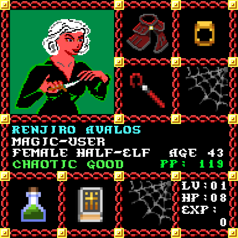 Renjiro Avalos is a Female Half-Elf, born to be a Magic-User. Since her birth, for the last 43 years, her alignment has been Chaotic Good and she has been honing her skills with the Cursed Quarterstaff. She also carries the following: [Potion of Healing ] [Phlan Journal Entries 29-40] > > > Renjiro Avalos is part of the Genesis Series of the Players Guild NFT Pool of Radiance Tribute.