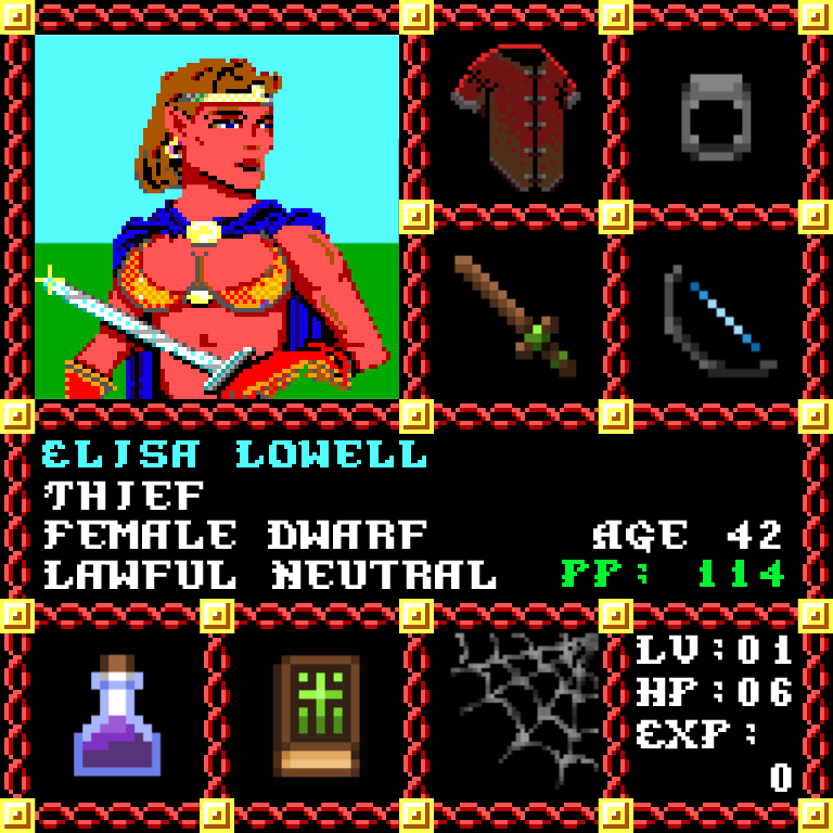 Elisa Lowell is a Female Dwarf, born to be a Thief. Since her birth, for the last 42 years, her alignment has been Lawful Neutral and she has been honing her skills with the Short Sword. She also carries the following: [Potion of Fire Resistance ] [Phlan Journal Entries 1-15] > > > Elisa Lowell is part of the Genesis Series of the Players Guild NFT Pool of Radiance Tribute.