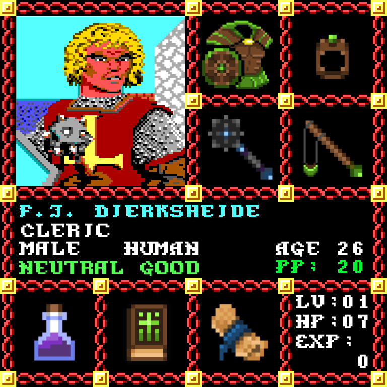 FJ Dierksheide is a Male Human, born to be a Cleric. Since his birth, for the last 26 years, his alignment has been Neutral Good and he has been honing his skills with the Mace +1. He also carries the following: [Potion of Fire Resistance ] [Phlan Journal Entries 1-15] [Scroll of Protection from Evil x80] > > > FJ Dierksheide is part of the Genesis Series of the Players Guild NFT Pool of Radiance Tribute.