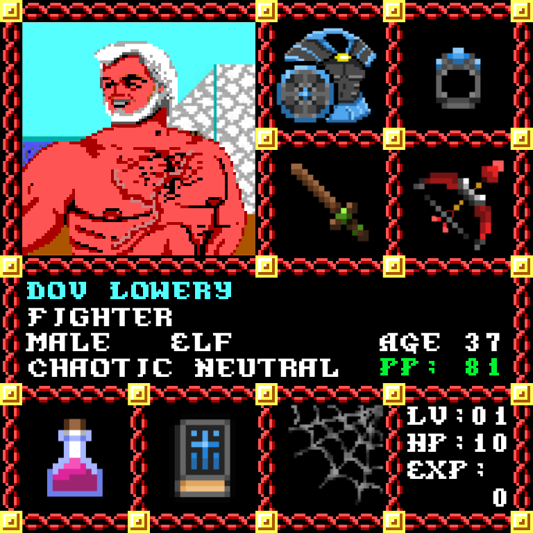 Dov Lowery is a Male Elf, born to be a Fighter. Since his birth, for the last 37 years, his alignment has been Chaotic Neutral and he has been honing his skills with the Short Sword. He also carries the following: [Potion of Strength] [Phlan Journal Entries 16-28] > > > Dov Lowery is part of the Genesis Series of the Players Guild NFT Pool of Radiance Tribute.