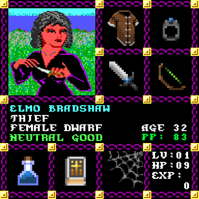 Elmo Bradshaw is a Female Dwarf, born to be a Thief. Since her birth, for the last 32 years, her alignment has been Neutral Good and she has been honing her skills with the Broadsword +2. She also carries the following: [Potion of Extra Healing ] [Phlan Journal Entries 29-40]    >   >   >   Elmo Bradshaw is part of the Genesis Series of the Players Guild NFT Pool of Radiance Tribute.