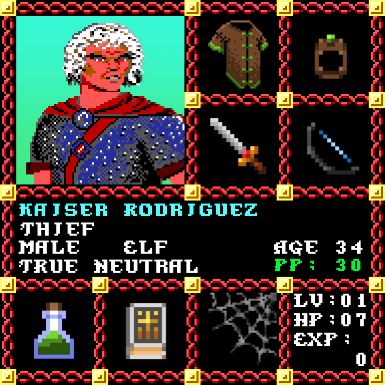 Kaiser Rodriguez is a Male Elf, born to be a Thief. Since his birth, for the last 34 years, his alignment has been True Neutral and he has been honing his skills with the Short Sword +2. He also carries the following: [Potion of Healing ] [Phlan Journal Entries 29-40]    >   >   >   Kaiser Rodriguez is part of the Genesis Series of the Players Guild NFT Pool of Radiance Tribute.