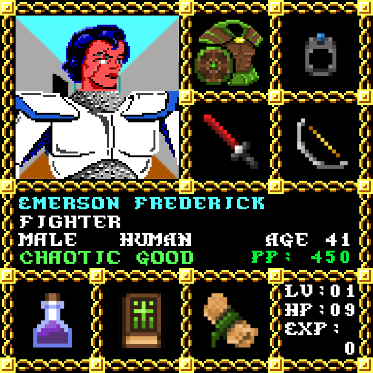 Emerson Frederick is a Male Human, born to be a Fighter. Since his birth, for the last 41 years, his alignment has been Chaotic Good and he has been honing his skills with the Short Sword Cursed. He also carries the following: [Potion of Fire Resistance ] [Phlan Journal Entries 1-15] [Scroll of Sleep x50]   >   >   >   Emerson Frederick is part of the Genesis Series of the Players Guild NFT Pool of Radiance Tribute.