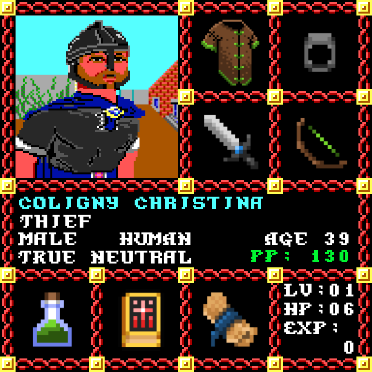 Coligny Christina is a Male Human, born to be a Thief. Since his birth, for the last 39 years, his alignment has been True Neutral and he has been honing his skills with the Broadsword +2. He also carries the following: [Potion of Healing ] [Phlan Journal Entries 41-50] [Scroll of Haste x50]   >   >   >   Coligny Christina is part of the Genesis Series of the Players Guild NFT Pool of Radiance Tribute.