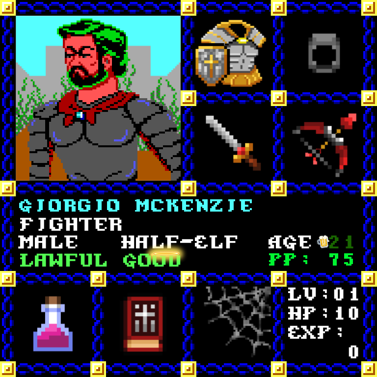 Giorgio Mckenzie is a Male Half-Elf, born to be a Fighter. Since his birth, for the last 21 years, his alignment has been Lawful Good and he has been honing his skills with the Short Sword +2. He also carries the following: [Potion of Strength] [Phlan Journal Entries 51-58]    >   >   >   Giorgio Mckenzie is part of the Genesis Series of the Players Guild NFT Pool of Radiance Tribute.