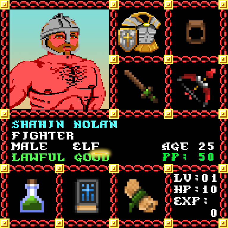 Shahin Nolan is a Male Elf, born to be a Fighter. Since his birth, for the last 25 years, his alignment has been Lawful Good and he has been honing his skills with the Short Sword. He also carries the following: [Potion of Healing ] [Phlan Journal Entries 16-28] [Scroll of Sleep x50]   >   >   >   Shahin Nolan is part of the Genesis Series of the Players Guild NFT Pool of Radiance Tribute.