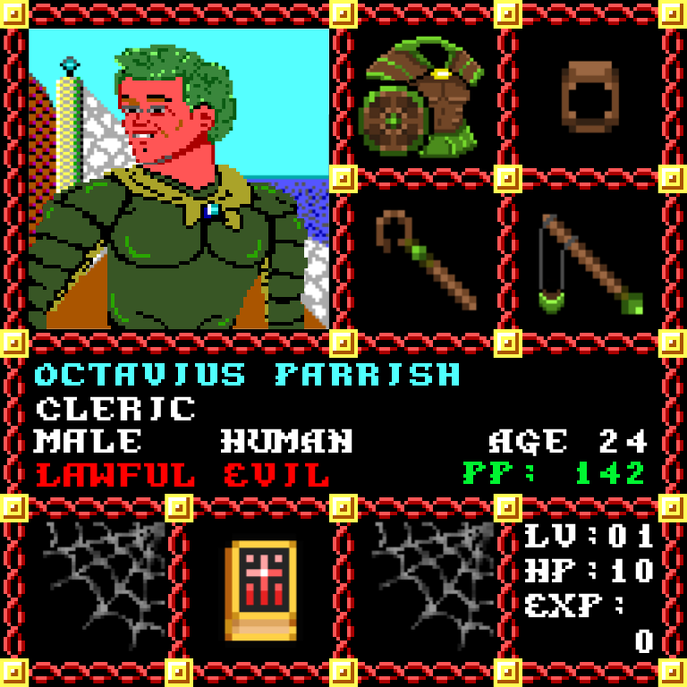 Octavius Parrish is a Male Human, born to be a Cleric. Since his birth, for the last 24 years, his alignment has been Lawful Evil and he has been honing his skills with the Quarterstaff. He also carries the following:  [Phlan Journal Entries 41-50]    >   >   >   Octavius Parrish is part of the Genesis Series of the Players Guild NFT Pool of Radiance Tribute.