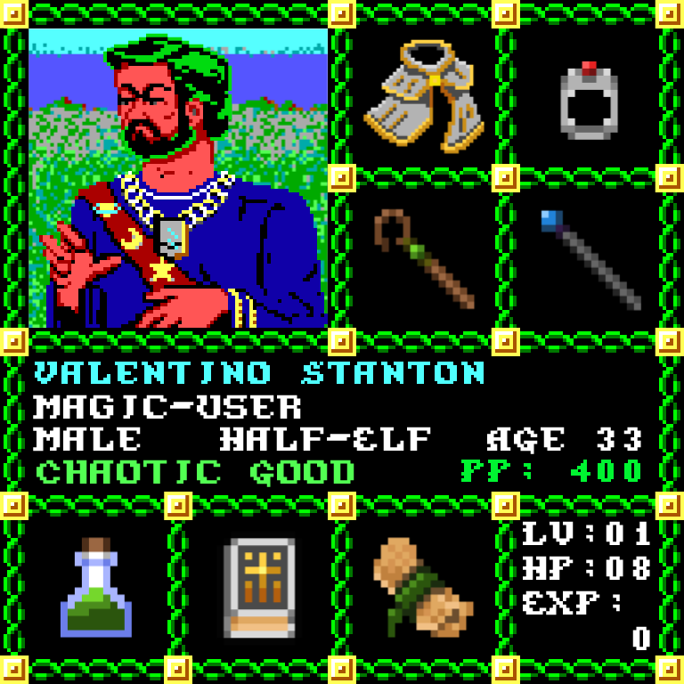 Valentino Stanton is a Male Half-Elf, born to be a Magic-User. Since his birth, for the last 33 years, his alignment has been Chaotic Good and he has been honing his skills with the Quarterstaff. He also carries the following: [Potion of Healing ] [Phlan Journal Entries 29-40] [Scroll of Sleep x50] > > > Valentino Stanton is part of the Genesis Series of the Players Guild NFT Pool of Radiance Tribute.