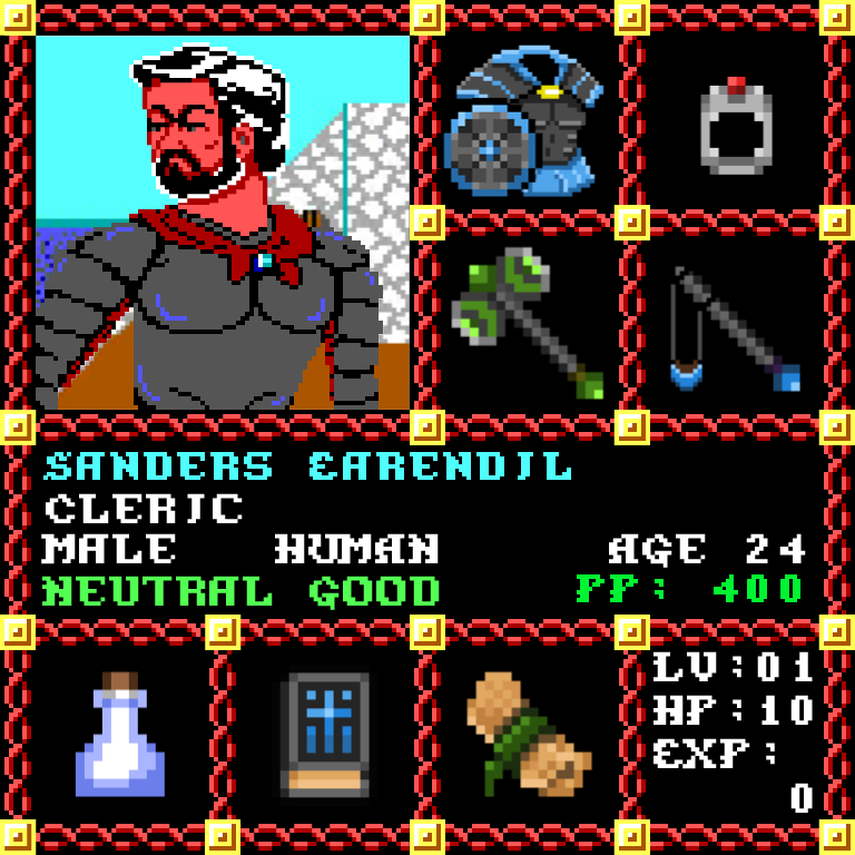 Sanders Earendil is a Male Human, born to be a Cleric. Since his birth, for the last 24 years, his alignment has been Neutral Good and he has been honing his skills with the Hammer. He also carries the following: [Potion of Speed] [Phlan Journal Entries 16-28] [Scroll of Cure Light Wounds x100] > > > Sanders Earendil is part of the Genesis Series of the Players Guild NFT Pool of Radiance Tribute.