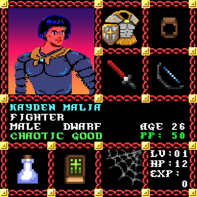 Kayden Malia is a Male Dwarf, born to be a Fighter. Since his birth, for the last 26 years, his alignment has been Chaotic Good and he has been honing his skills with the Short Sword Cursed. He also carries the following: [Potion of Speed] [Phlan Journal Entries 1-15] > > > Kayden Malia is part of the Genesis Series of the Players Guild NFT Pool of Radiance Tribute.