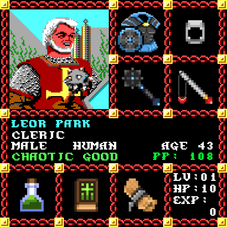 Leor Park is a Male Human, born to be a Cleric. Since his birth, for the last 43 years, his alignment has been Chaotic Good and he has been honing his skills with the Mace +1. He also carries the following: [Potion of Healing ] [Phlan Journal Entries 1-15] [Scroll of Hold Person x70] > > > Leor Park is part of the Genesis Series of the Players Guild NFT Pool of Radiance Tribute.