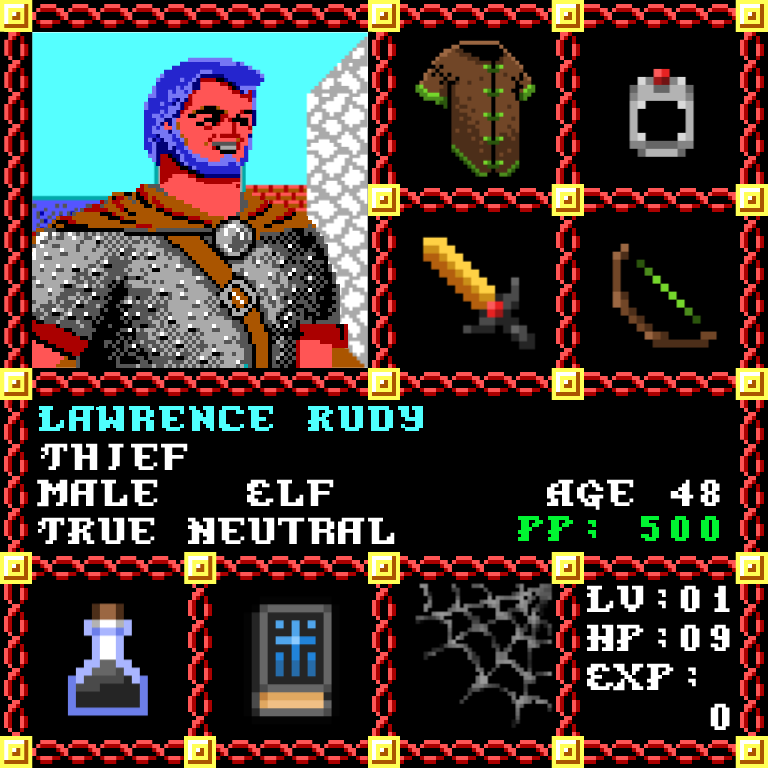 Lawrence Rudy is a Male Elf, born to be a Thief. Since his birth, for the last 48 years, his alignment has been True Neutral and he has been honing his skills with the Broadsword +5. He also carries the following: [Potion of Invisibility ] [Phlan Journal Entries 16-28] > > > Lawrence Rudy is part of the Genesis Series of the Players Guild NFT Pool of Radiance Tribute.