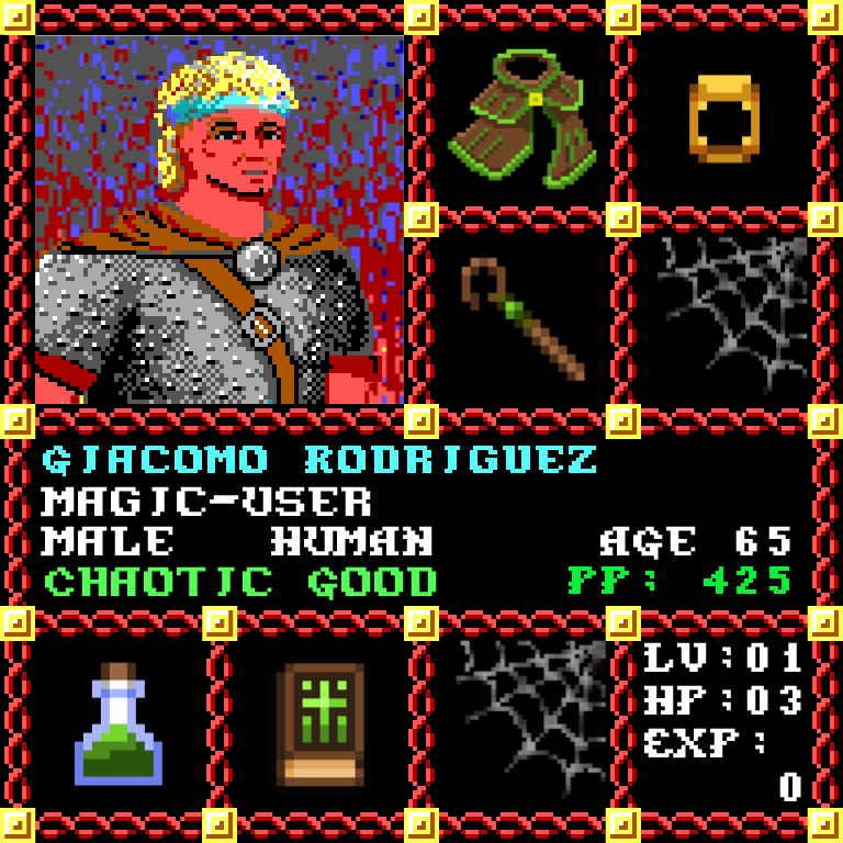 Giacomo Rodriguez is a Male Human, born to be a Magic-User. Since his birth, for the last 65 years, his alignment has been Chaotic Good and he has been honing his skills with the Quarterstaff. He also carries the following: [Potion of Healing ] [Phlan Journal Entries 1-15] > > > Giacomo Rodriguez is part of the Genesis Series of the Players Guild NFT Pool of Radiance Tribute.