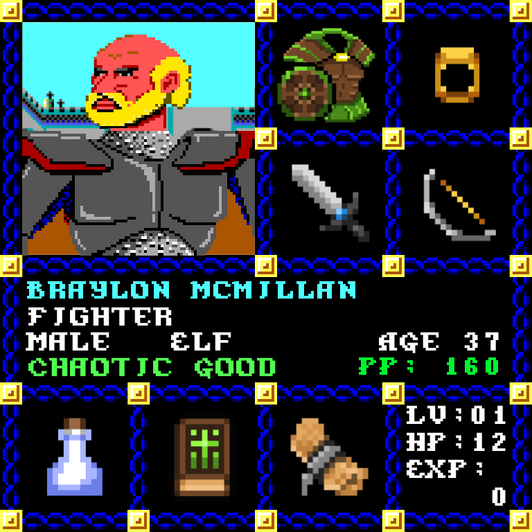 Braylon Mcmillan is a Male Elf, born to be a Fighter. Since his birth, for the last 37 years, his alignment has been Chaotic Good and he has been honing his skills with the Broadsword +2. He also carries the following: [Potion of Speed] [Phlan Journal Entries 1-15] [Scroll of Hold Person x70] > > > Braylon Mcmillan is part of the Genesis Series of the Players Guild NFT Pool of Radiance Tribute.
