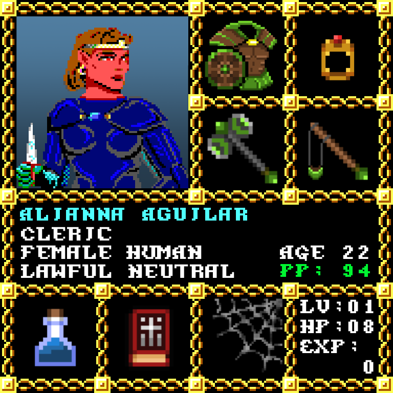 Alianna Aguilar is a Female Human, born to be a Cleric. Since her birth, for the last 22 years, her alignment has been Lawful Neutral and she has been honing her skills with the Hammer. She also carries the following: [Potion of Extra Healing ] [Phlan Journal Entries 51-58] > > > Alianna Aguilar is part of the Genesis Series of the Players Guild NFT Pool of Radiance Tribute.