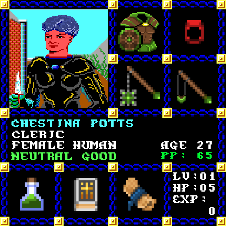 Chestina Potts is a Female Human, born to be a Cleric. Since her birth, for the last 27 years, her alignment has been Neutral Good and she has been honing her skills with the Flail. She also carries the following: [Potion of Healing ] [Phlan Journal Entries 29-40] [Scroll of Protection from Evil x80] > > > Chestina Potts is part of the Genesis Series of the Players Guild NFT Pool of Radiance Tribute.