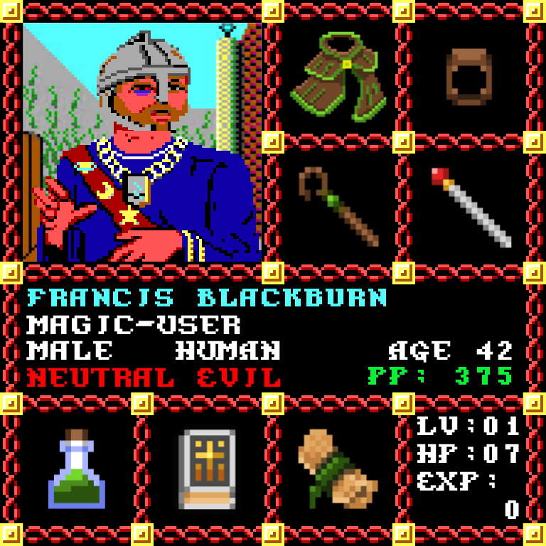 Francis Blackburn is a Male Human, born to be a Magic-User. Since his birth, for the last 42 years, his alignment has been Neutral Evil and he has been honing his skills with the Quarterstaff. He also carries the following: [Potion of Healing ] [Phlan Journal Entries 29-40] [Scroll of Sleep x50] > > > Francis Blackburn is part of the Genesis Series of the Players Guild NFT Pool of Radiance Tribute.