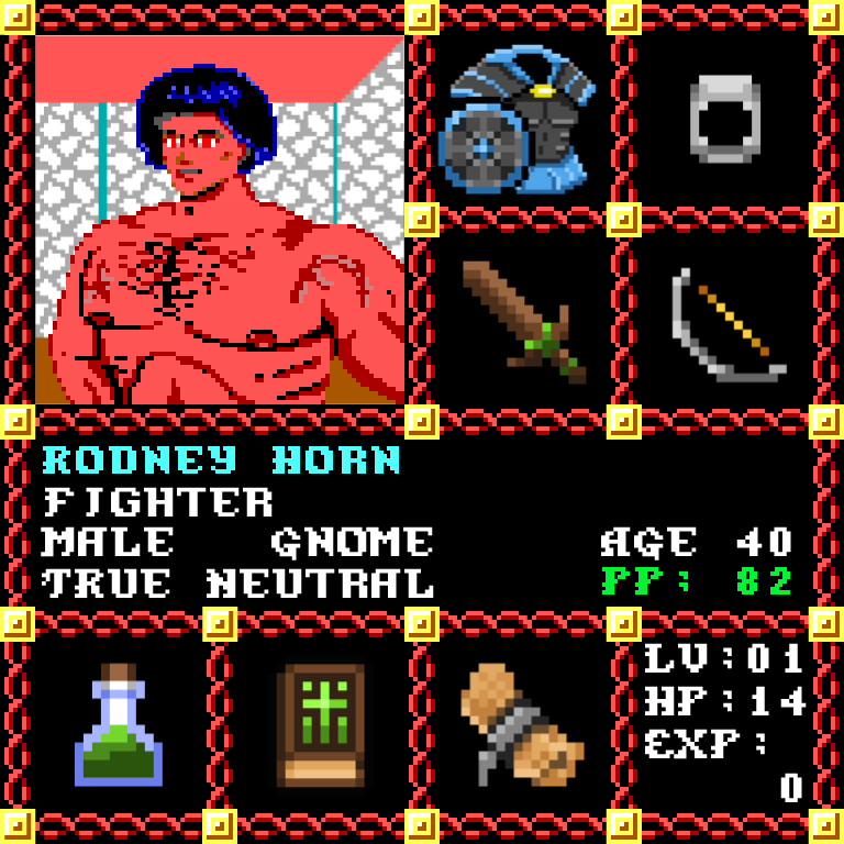 Rodney Horn is a Male Gnome, born to be a Fighter. Since his birth, for the last 40 years, his alignment has been True Neutral and he has been honing his skills with the Broadsword. He also carries the following: [Potion of Healing ] [Phlan Journal Entries 1-15] [Scroll of Hold Person x50] > > > Rodney Horn is part of the Genesis Series of the Players Guild NFT Pool of Radiance Tribute.