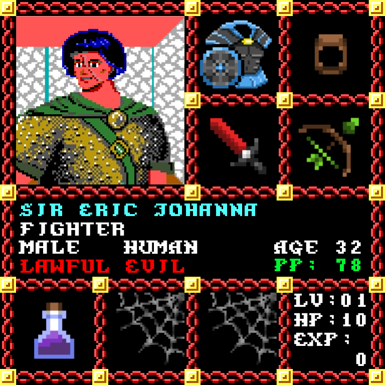 Sir Eric Johanna is a Male Human, born to be a Fighter. Since his birth, for the last 32 years, his alignment has been Lawful Evil and he has been honing his skills with the Broadsword Cursed. He also carries the following: [Potion of Fire Resistance ] > > > Sir Eric Johanna is part of the Genesis Series of the Players Guild NFT Pool of Radiance Tribute.
