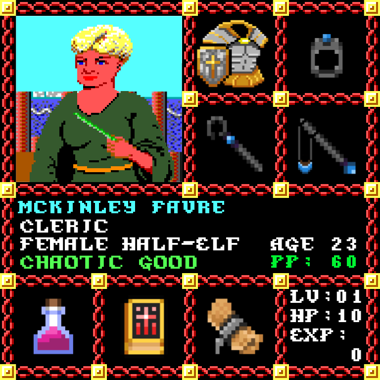 Mckinley Favre is a Female Half-Elf, born to be a Cleric. Since her birth, for the last 23 years, her alignment has been Chaotic Good and she has been honing her skills with the Staff +1. She also carries the following: [Potion of Strength] [Phlan Journal Entries 41-50] [Scroll of Hold Person x70] > > > Mckinley Favre is part of the Genesis Series of the Players Guild NFT Pool of Radiance Tribute.