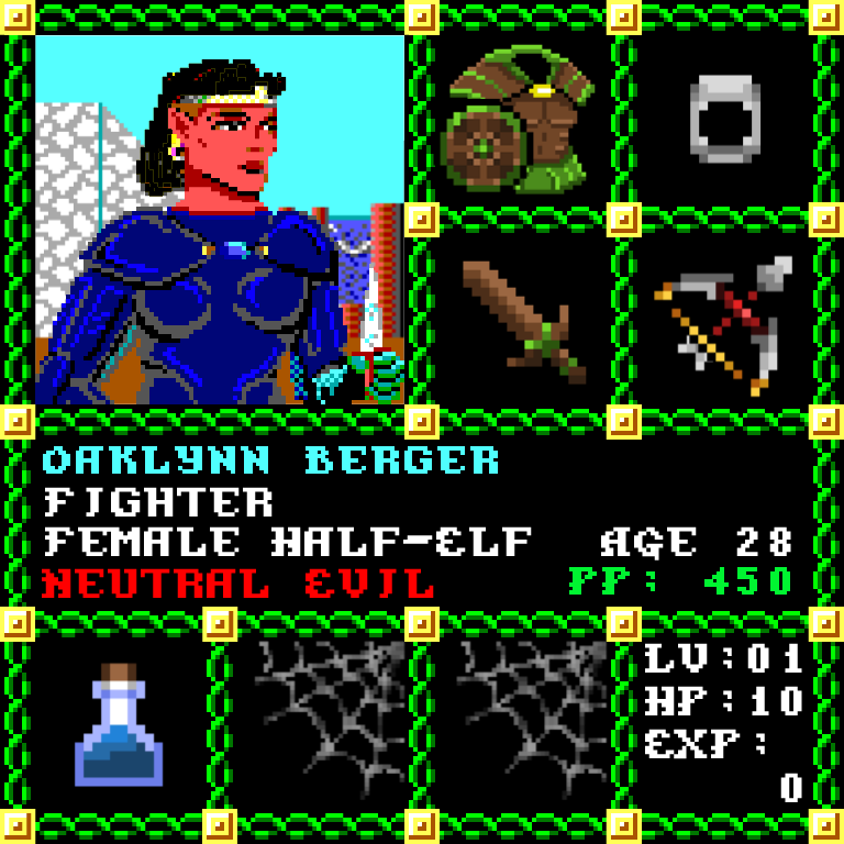 Oaklynn Berger is a Female Half-Elf, born to be a Fighter. Since her birth, for the last 28 years, her alignment has been Neutral Evil and she has been honing her skills with the Broadsword. She also carries the following: [Potion of Extra Healing ] > > > Oaklynn Berger is part of the Genesis Series of the Players Guild NFT Pool of Radiance Tribute.