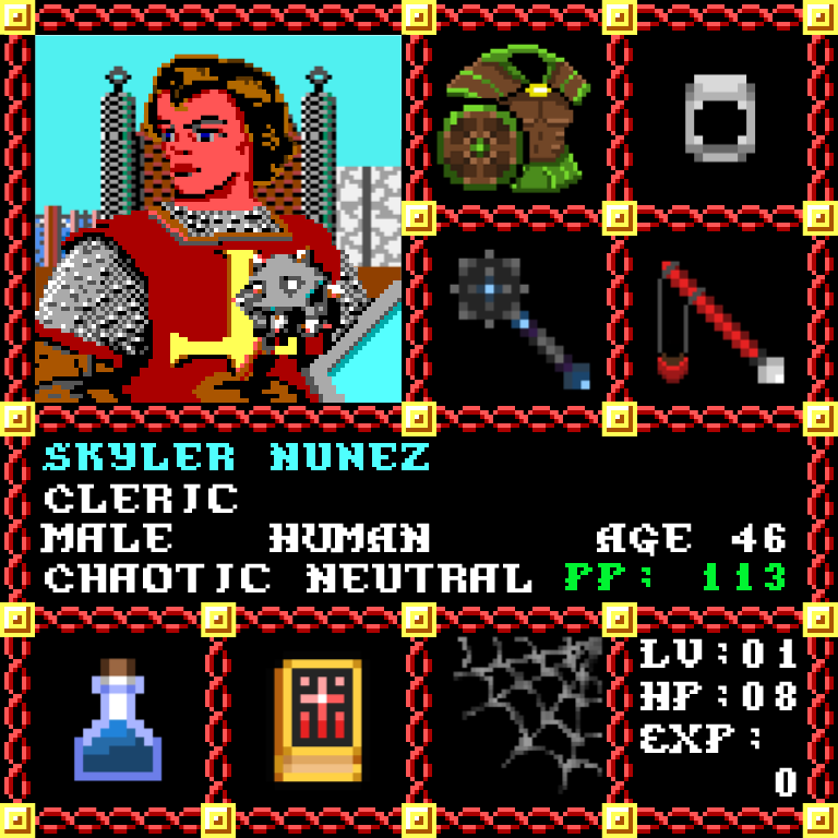 Skyler Nunez is a Male Human, born to be a Cleric. Since his birth, for the last 46 years, his alignment has been Chaotic Neutral and he has been honing his skills with the Mace +1. He also carries the following: [Potion of Extra Healing ] [Phlan Journal Entries 41-50] > > > Skyler Nunez is part of the Genesis Series of the Players Guild NFT Pool of Radiance Tribute.