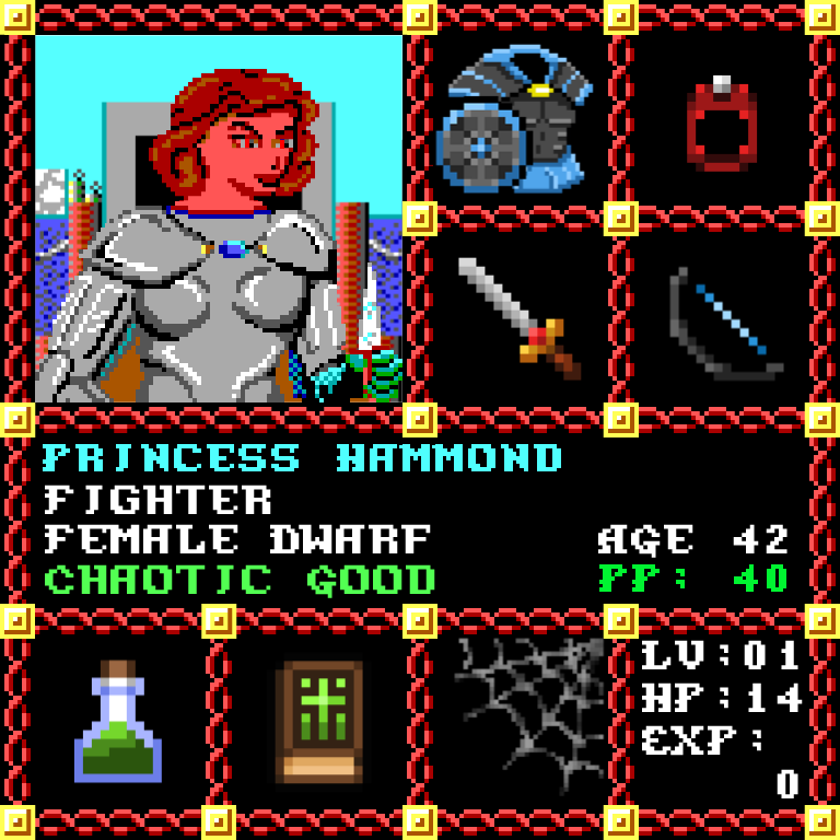 Princess Hammond is a Female Dwarf, born to be a Fighter. Since her birth, for the last 42 years, her alignment has been Chaotic Good and she has been honing her skills with the Short Sword +2. She also carries the following: [Potion of Healing ] [Phlan Journal Entries 1-15] > > > Princess Hammond is part of the Genesis Series of the Players Guild NFT Pool of Radiance Tribute.
