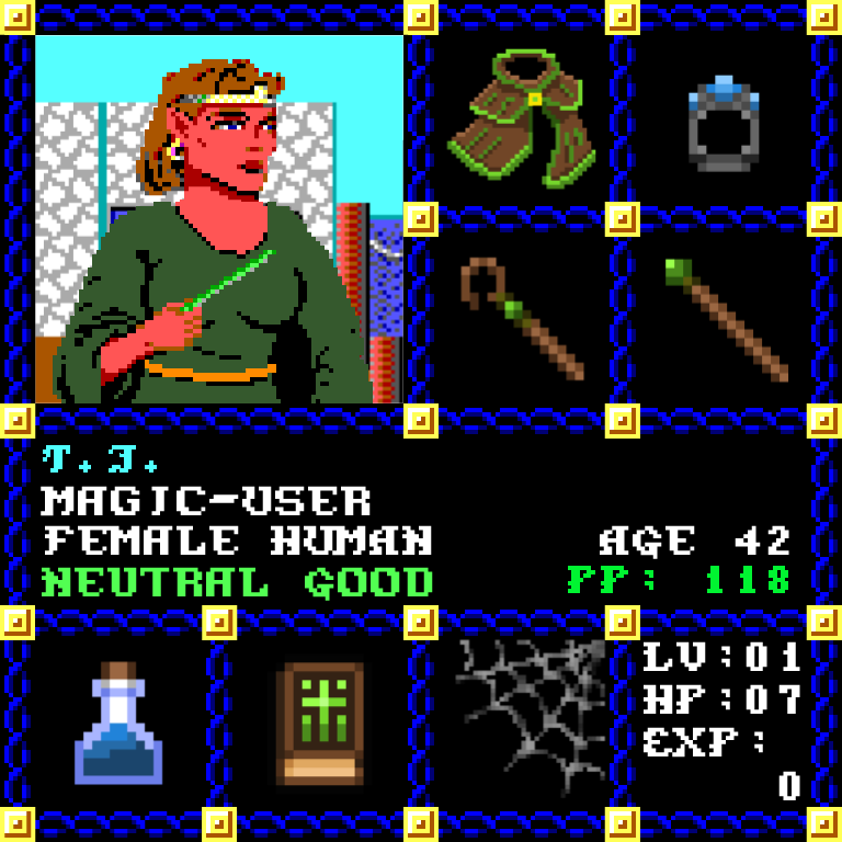 TJ is a Female Human, born to be a Magic-User. Since her birth, for the last 42 years, her alignment has been Neutral Good and she has been honing her skills with the Quarterstaff. She also carries the following: [Potion of Extra Healing ] [Phlan Journal Entries 1-15] > > > TJ is part of the Genesis Series of the Players Guild NFT Pool of Radiance Tribute.