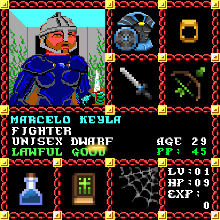 Marcelo Keyla is a Unisex Dwarf, born to be a Fighter. Since their birth, for the last 29 years, their alignment has been Lawful Good and they have been honing their skills with the Short Sword +1. They also carry the following: [Potion of Extra Healing ] [Phlan Journal Entries 1-15] > > > Marcelo Keyla is part of the Genesis Series of the Players Guild NFT Pool of Radiance Tribute.