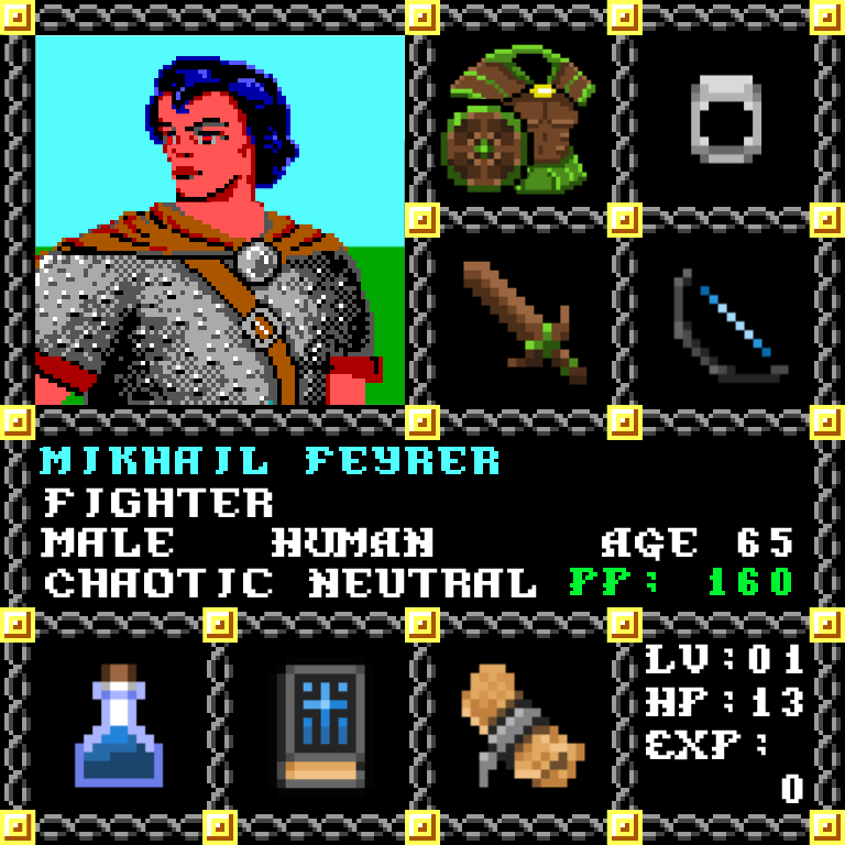Mikhail Feyrer is a Male Human, born to be a Fighter. Since his birth, for the last 65 years, his alignment has been Chaotic Neutral and he has been honing his skills with the Broadsword. He also carries the following: [Potion of Extra Healing ] [Phlan Journal Entries 16-28] [Scroll of Hold Person x50] > > > Mikhail Feyrer is part of the Genesis Series of the Players Guild NFT Pool of Radiance Tribute.